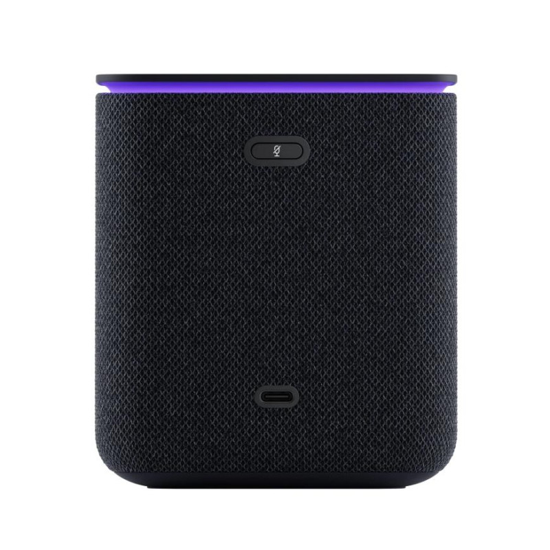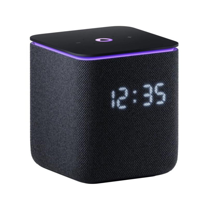 Корпус колонки, выполненный из ткани, не только стильно выглядит, но и обеспечивает приятные тактильные ощущения, защищает динамики и смягчает звук. Встроенный экран светится на текстильной поверхности.